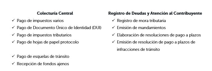 Entre los servicios que brinda la Colecturía y el Área de Registro de Deudas y Atención al Contribuyente se encuentran: