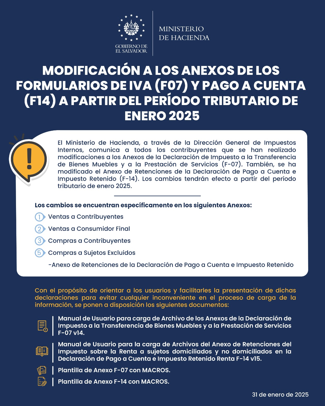 El Ministerio de Hacienda, a través de la Dirección General de Impuestos Internos, comunica a todos los contribuyentes que se han realizado modificaciones a los Anexos de la Declaración de Impuesto a la Transferencia de Bienes Muebles y a la Prestación de Servicios (F-07). También, se ha modificado el anexo de Retenciones de la Declaración de Pago a Cuenta e Impuesto Retenido (F-14). Los cambios tendrán efecto a partir del período tributario de enero 2025.